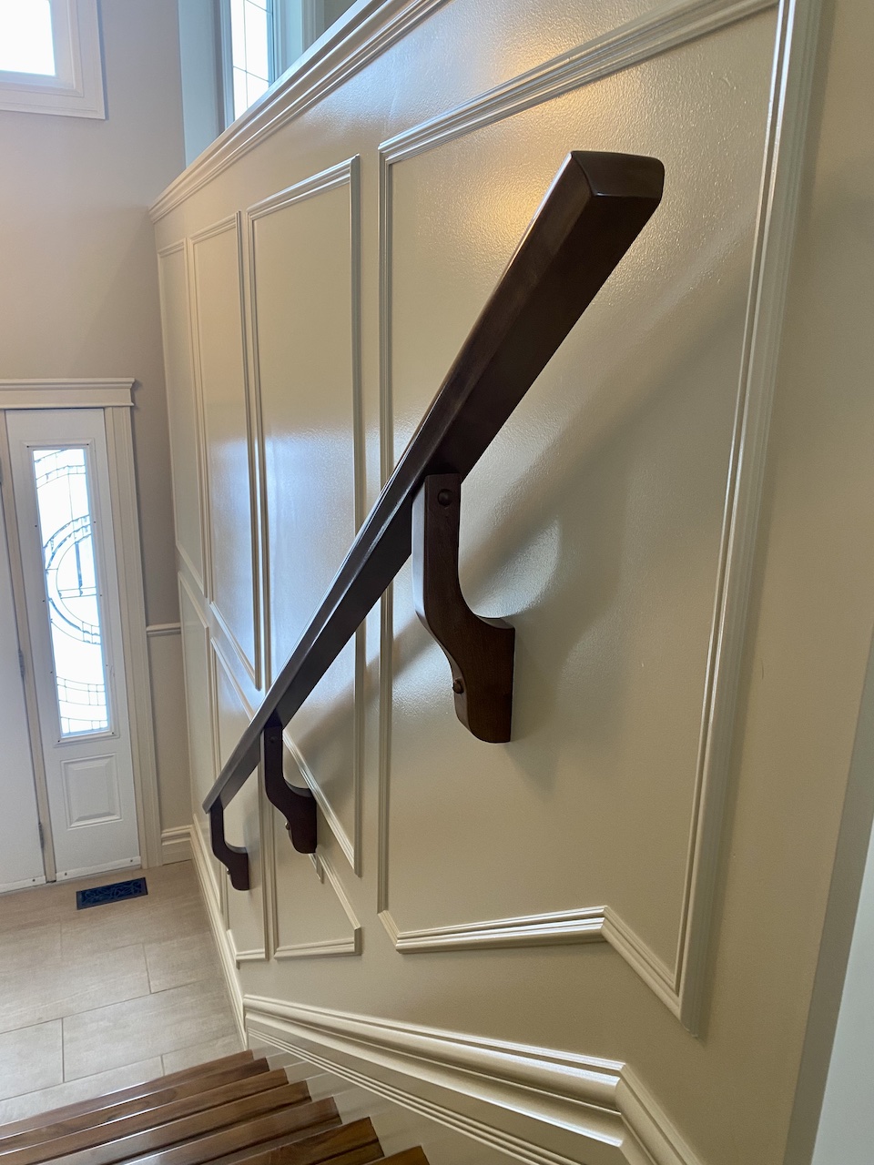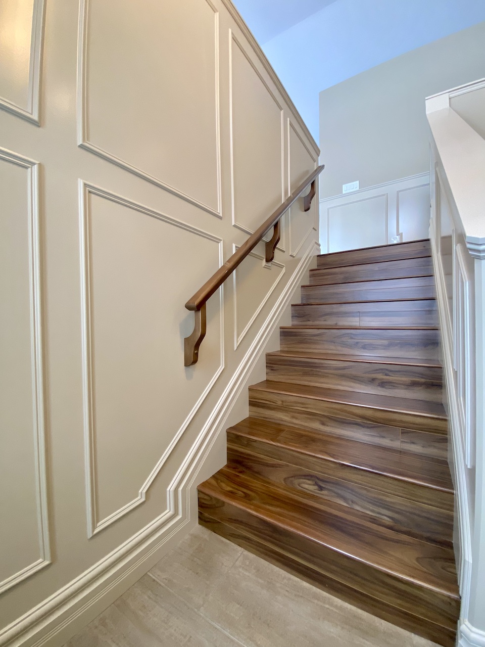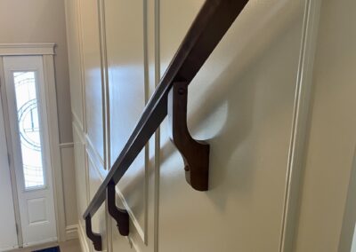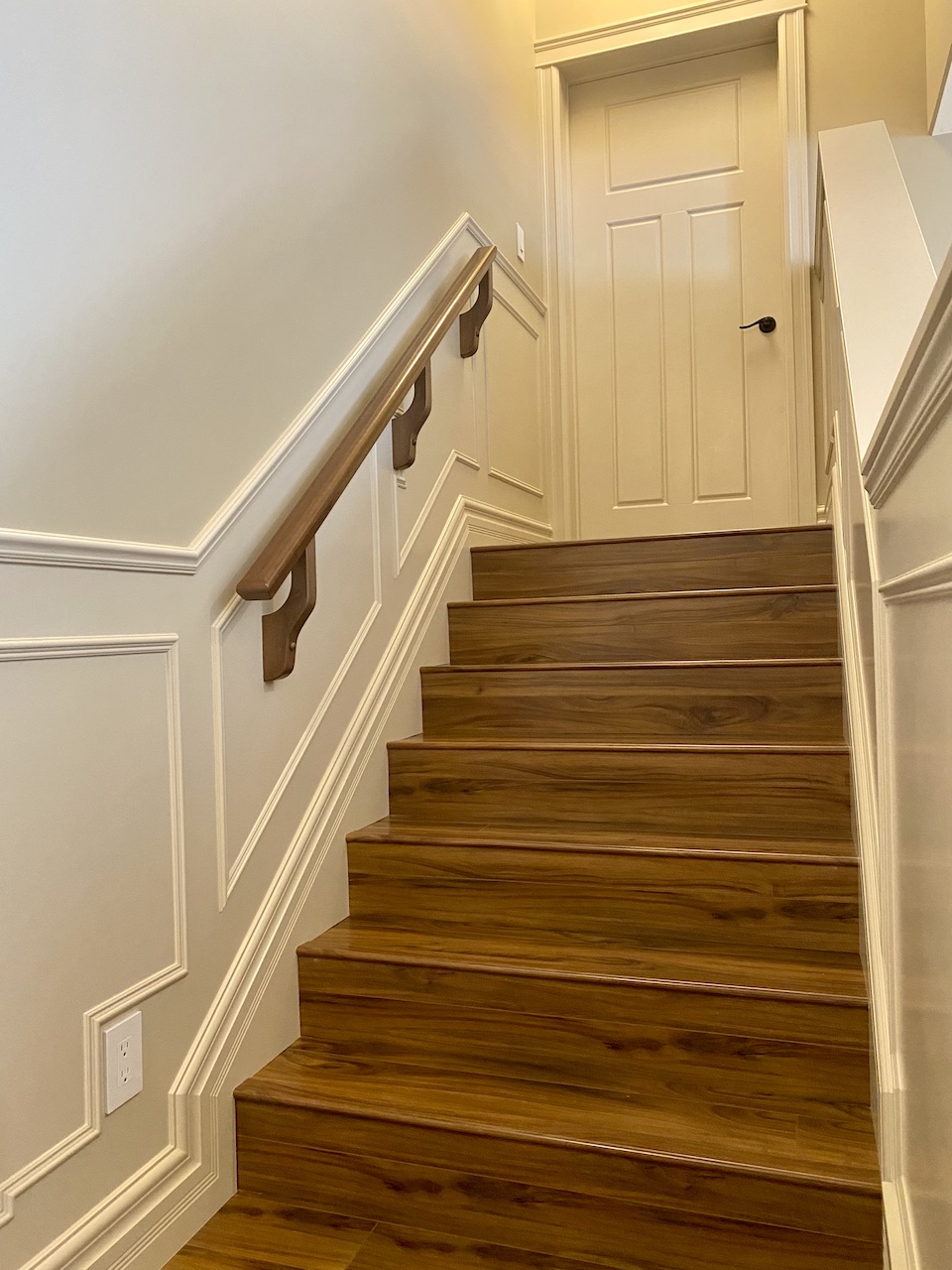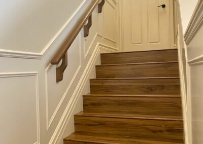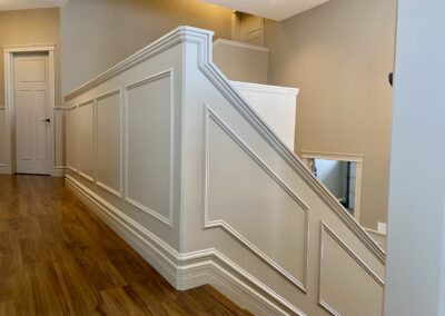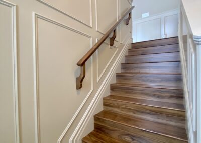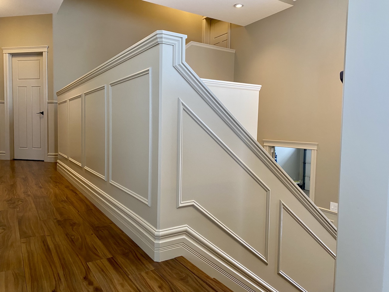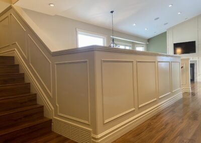 We were able to schedule this work around their holidays. After prepping the site with floor and dust protection, we installed all of the trim panels, including custom capping and stair stringers, and finished it off with a spray finish for the paint.