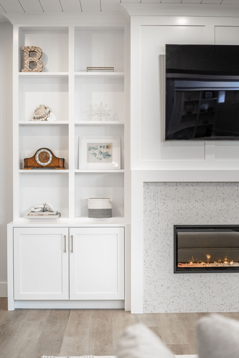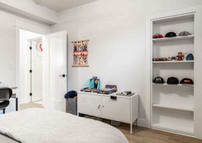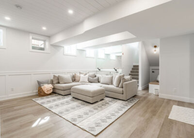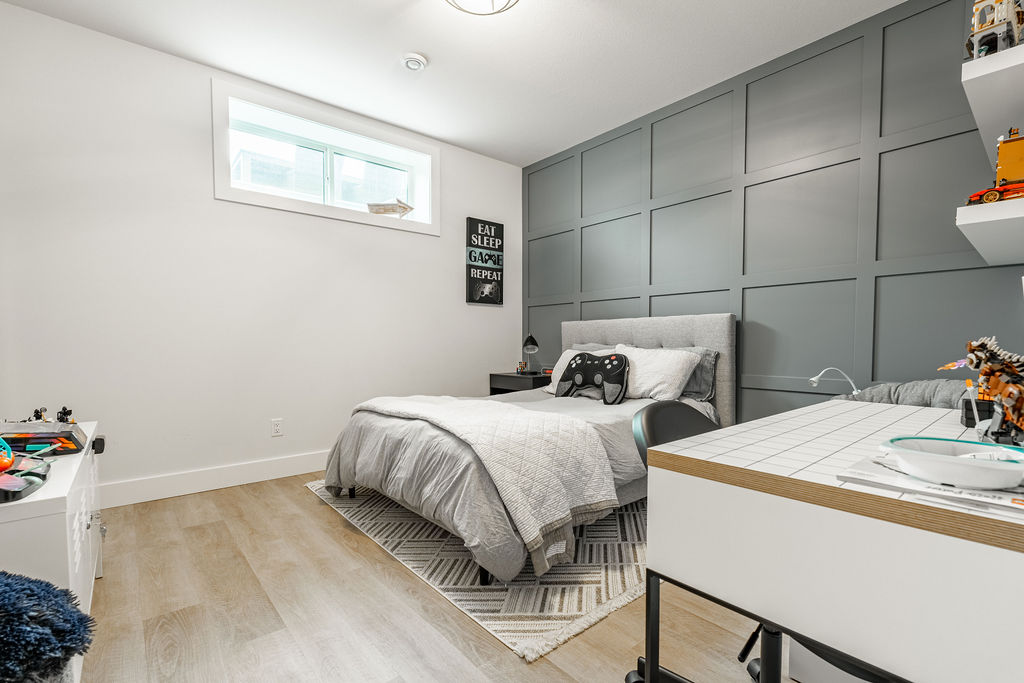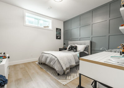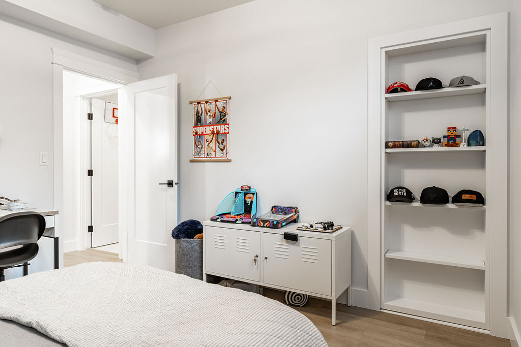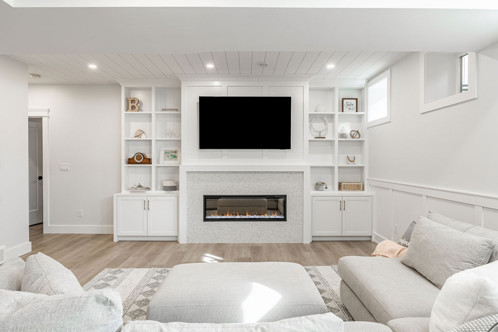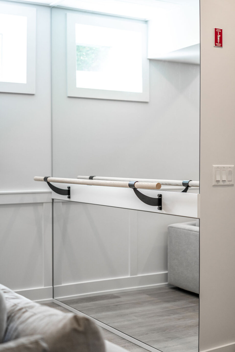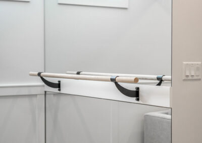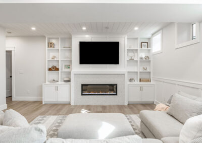 Basement development included a bright and spacious entertainment room, with a mirror and rail for dance practice, wet bar and mini fridge, fireplace and television above custom built-in mantle. Also an additional bedroom with a secret closet and stylish bathroom to complete the space.
