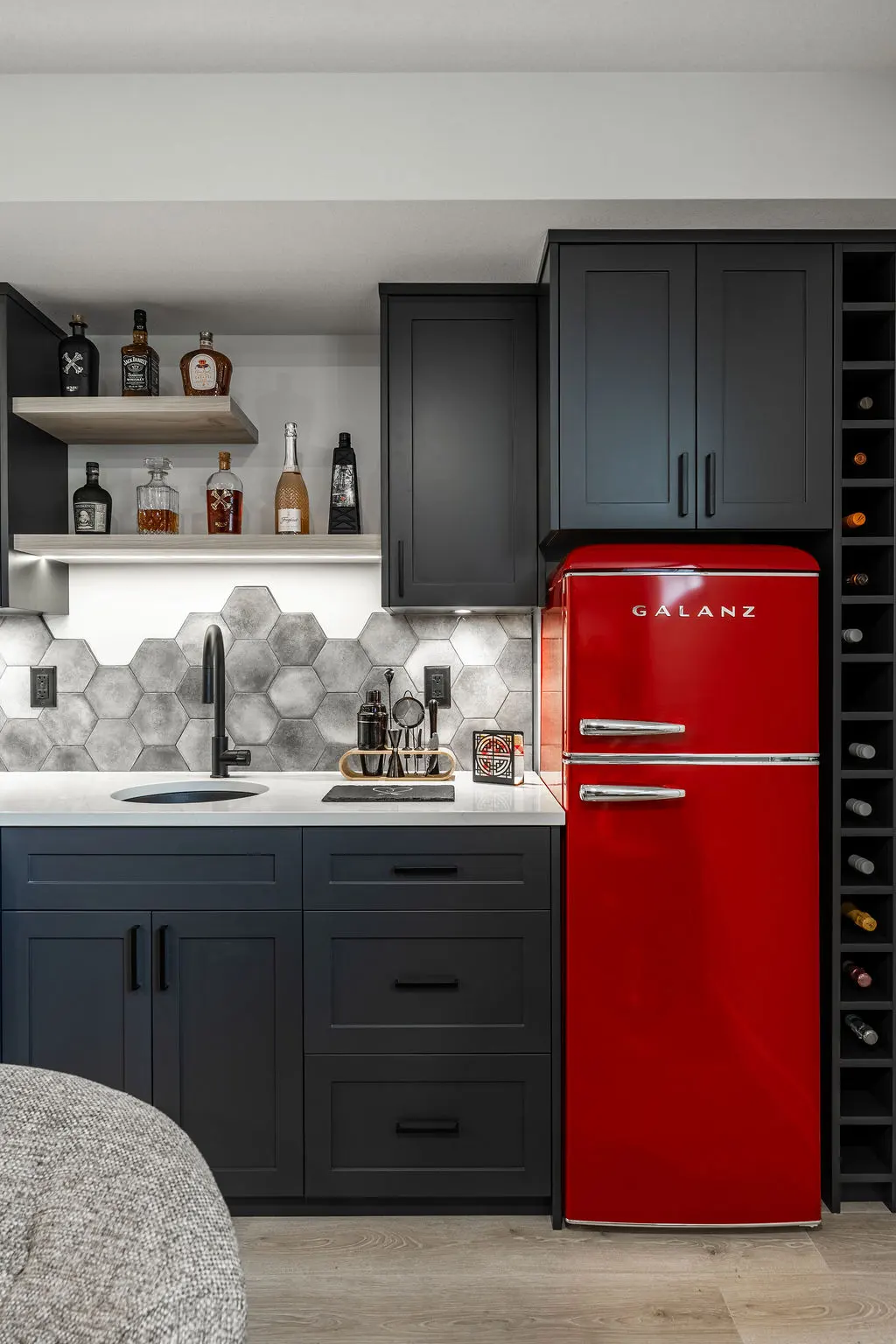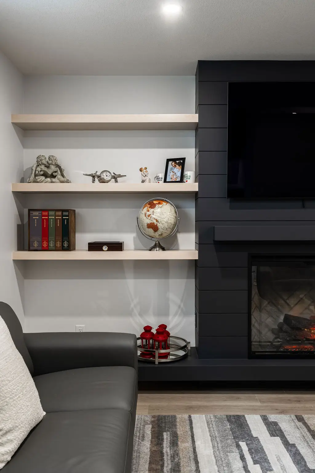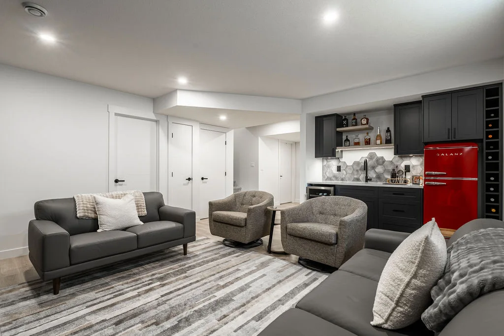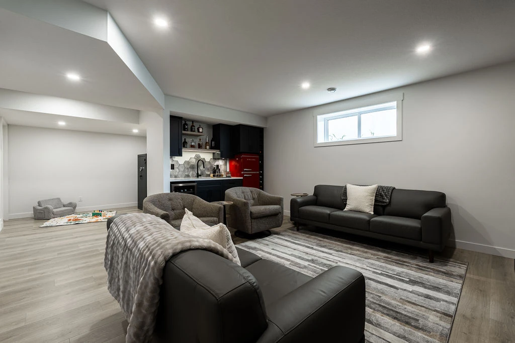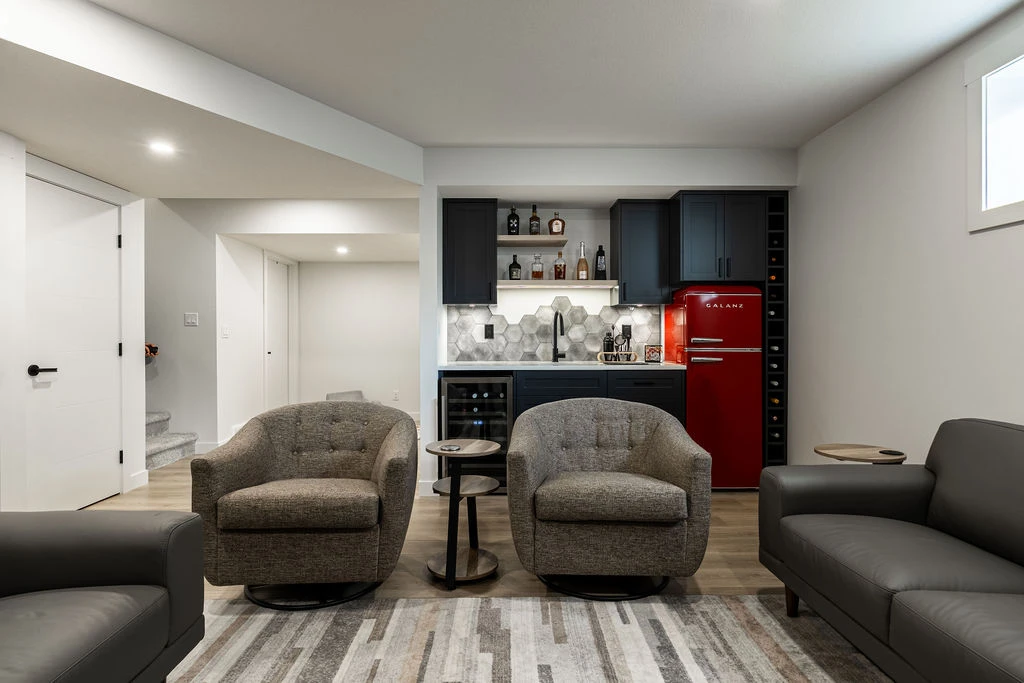 These basement enhancements were completed in a partially finished lower level. The homeowners wanted to carve out a cozy home theater nook and a multifunctional wet bar, while also maximizing natural light and storage. They provided a handful of inspirational images—mood boards featuring moody velvet seating, backlit shelving, and sleek quartz counters—that guided the layout and material choices.