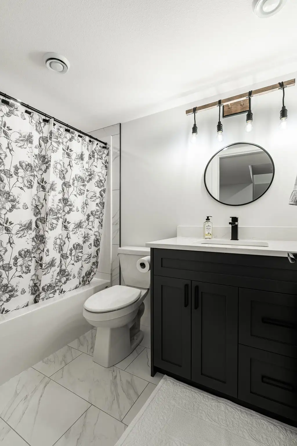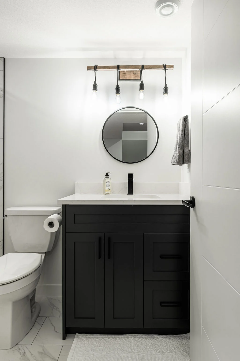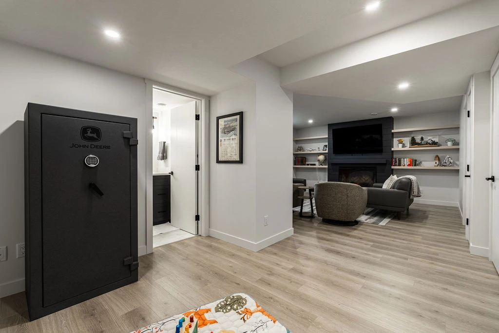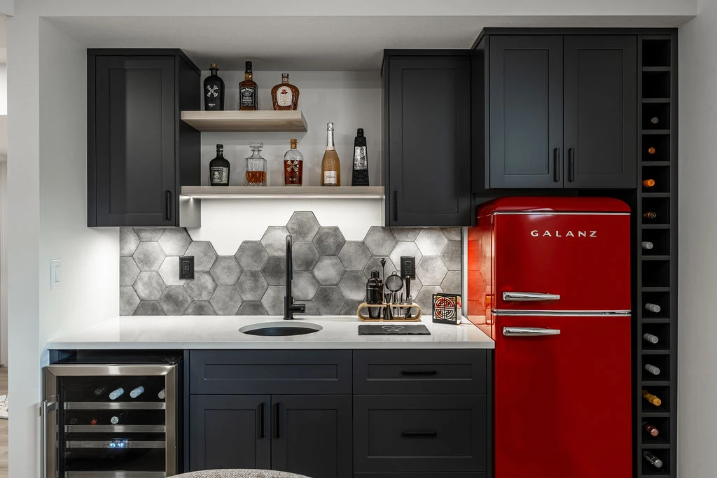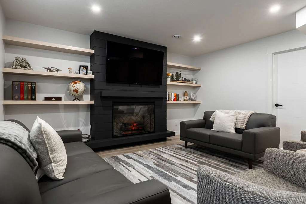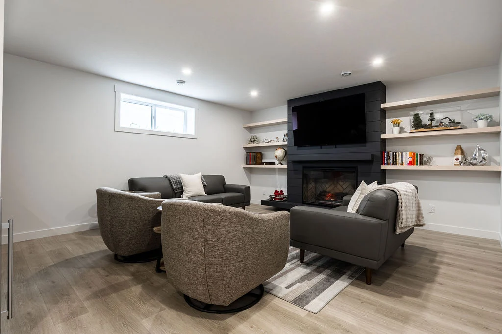 These basement enhancements were completed in a partially finished lower level. The homeowners wanted to carve out a cozy home theater nook and a multifunctional wet bar, while also maximizing natural light and storage. They provided a handful of inspirational images—mood boards featuring moody velvet seating, backlit shelving, and sleek quartz counters—that guided the layout and material choices.