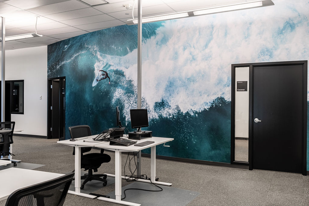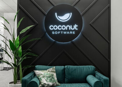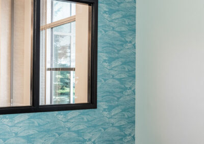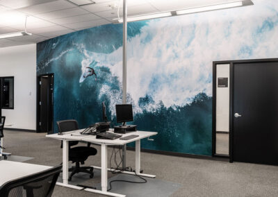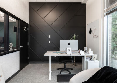 We refreshed each office with wallpaper, fresh paint and white boards. The boardroom and the CEO’s office were dressed up with painted trim feature walls and the common area included vinyl graphic feature walls. We also built a partition wall to create an entranceway with a custom trim feature and backlit metal signage.