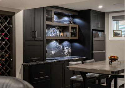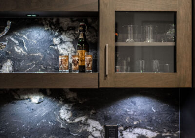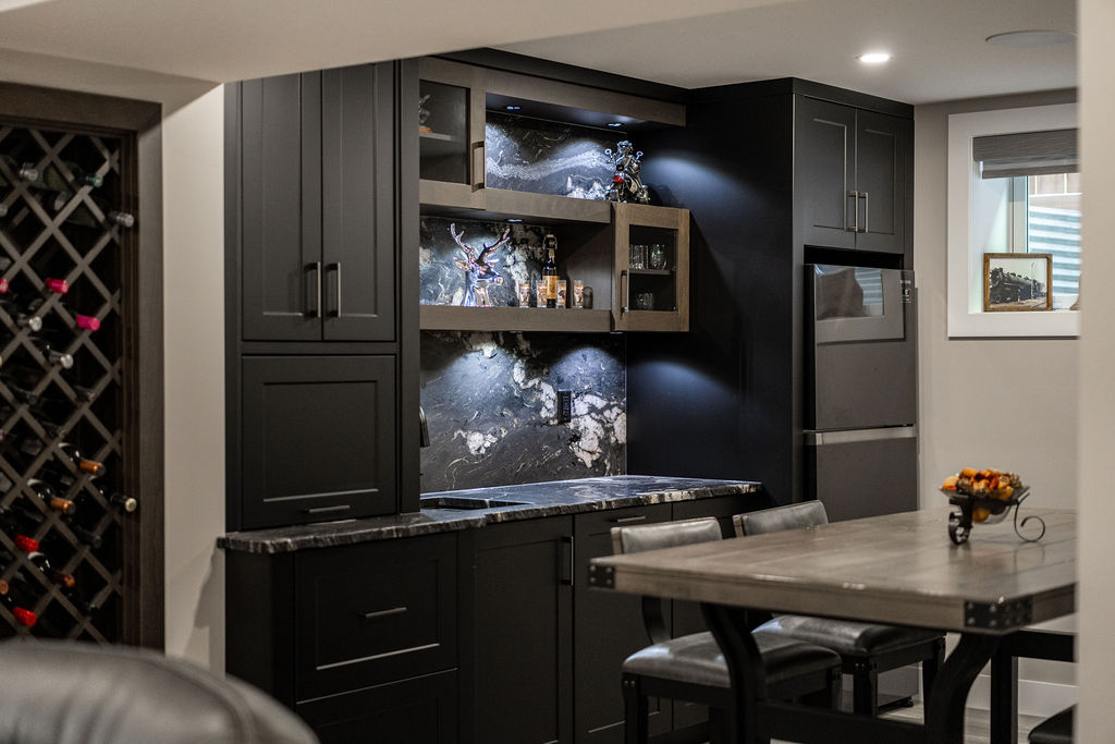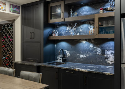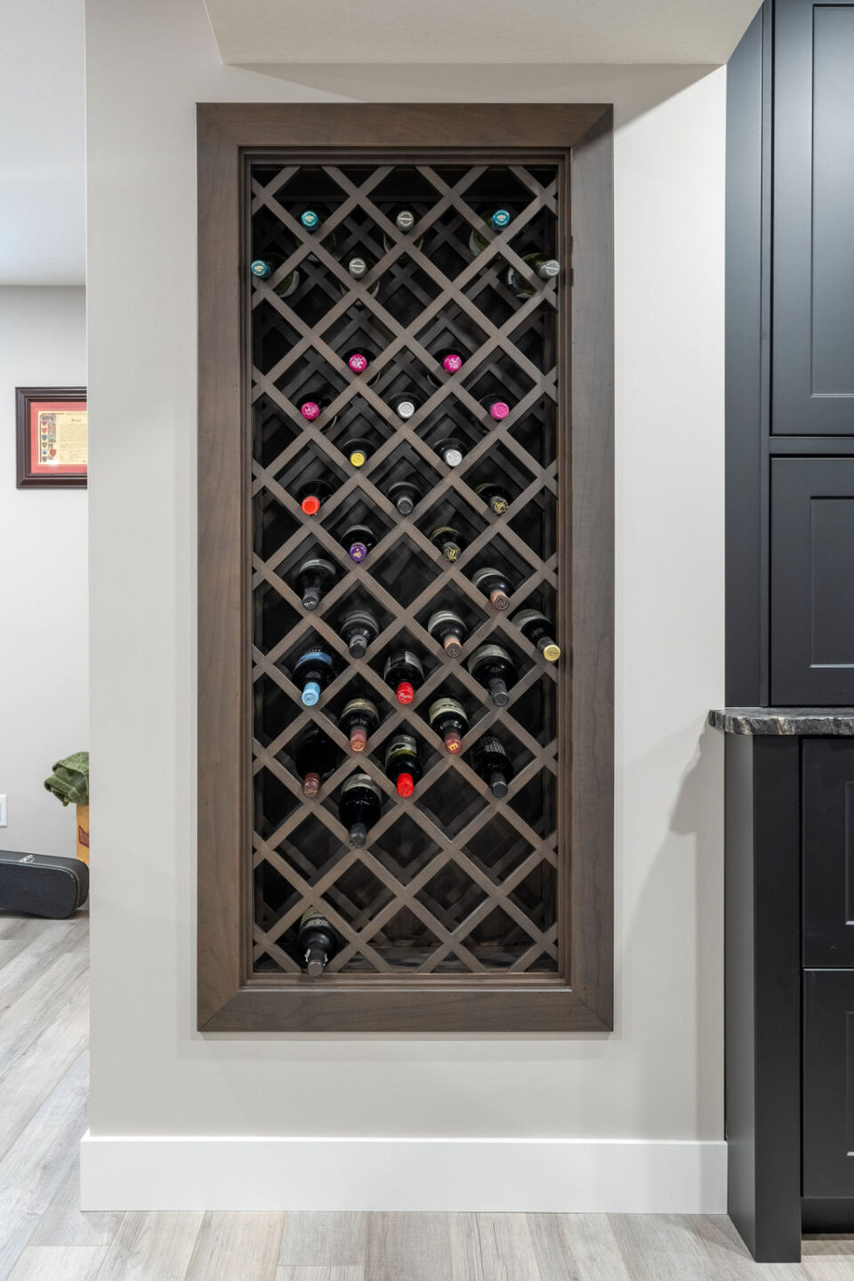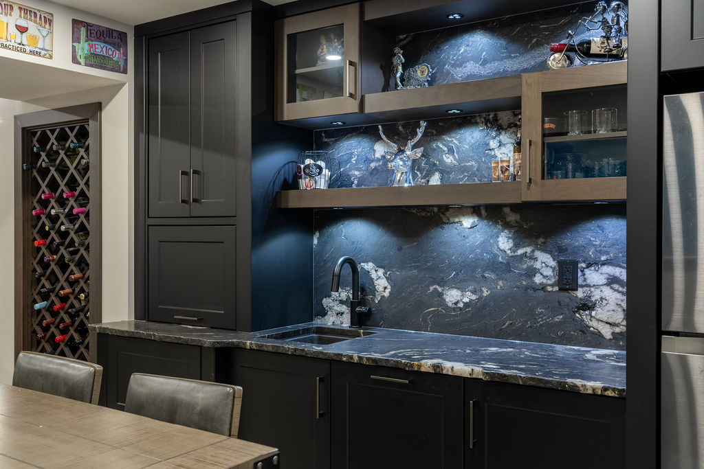 We went all out on the gorgeous custom wet bar, complete with a stunning live edge granite countertop and full height granite backsplash and a beautiful, latticed wine rack.