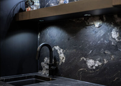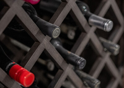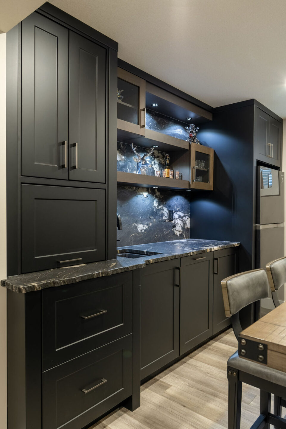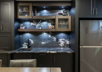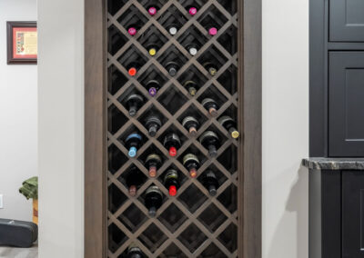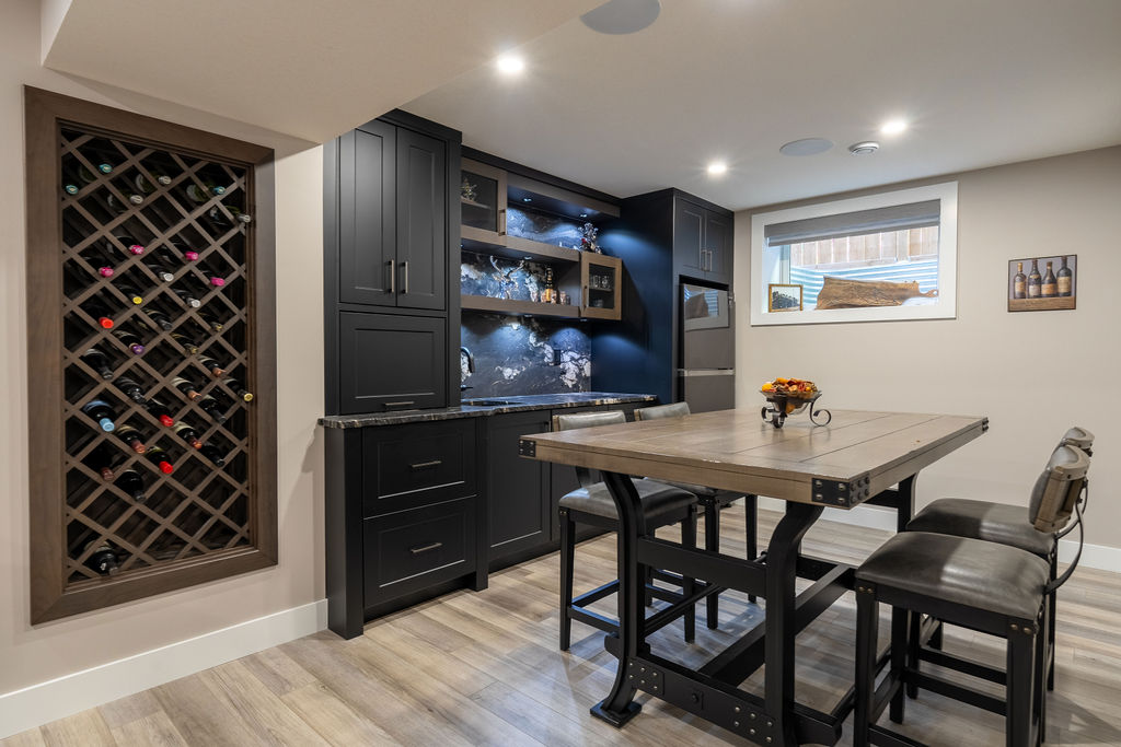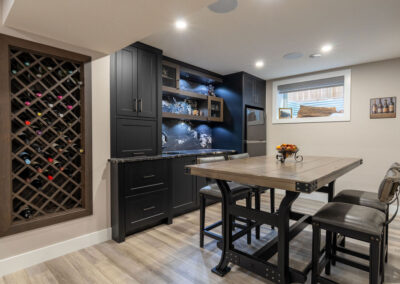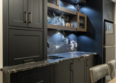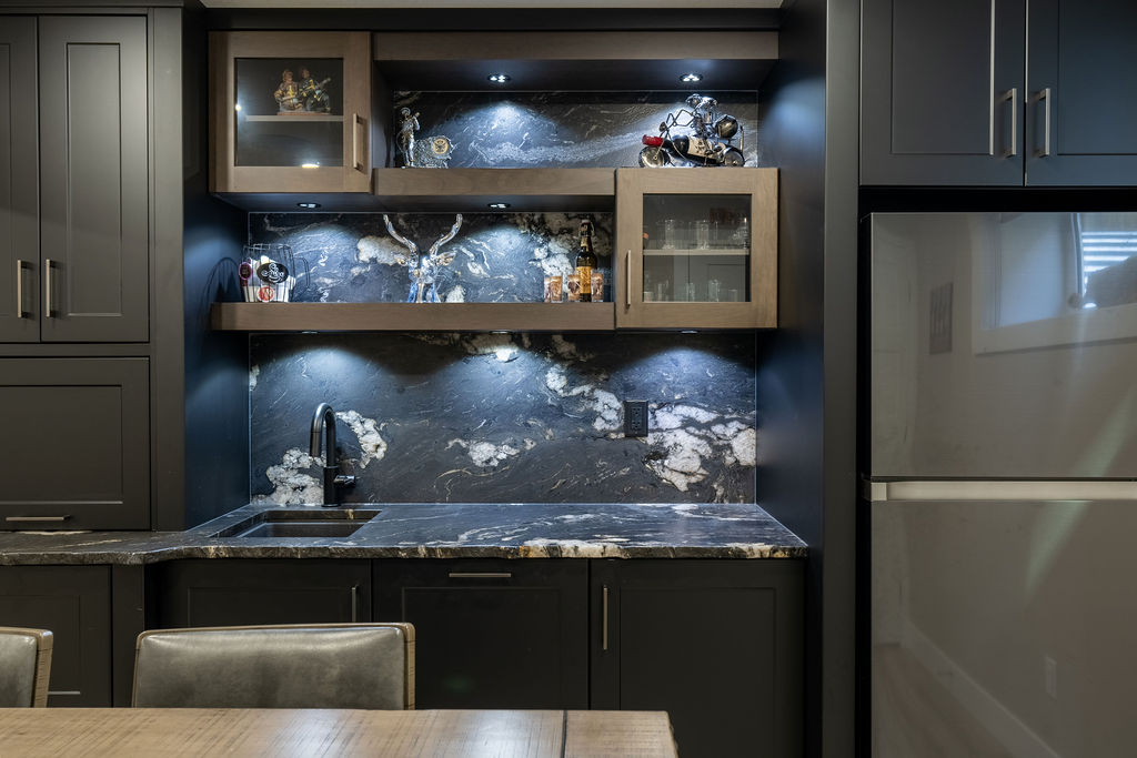 We went all out on the gorgeous custom wet bar, complete with a stunning live edge granite countertop and full height granite backsplash and a beautiful, latticed wine rack.