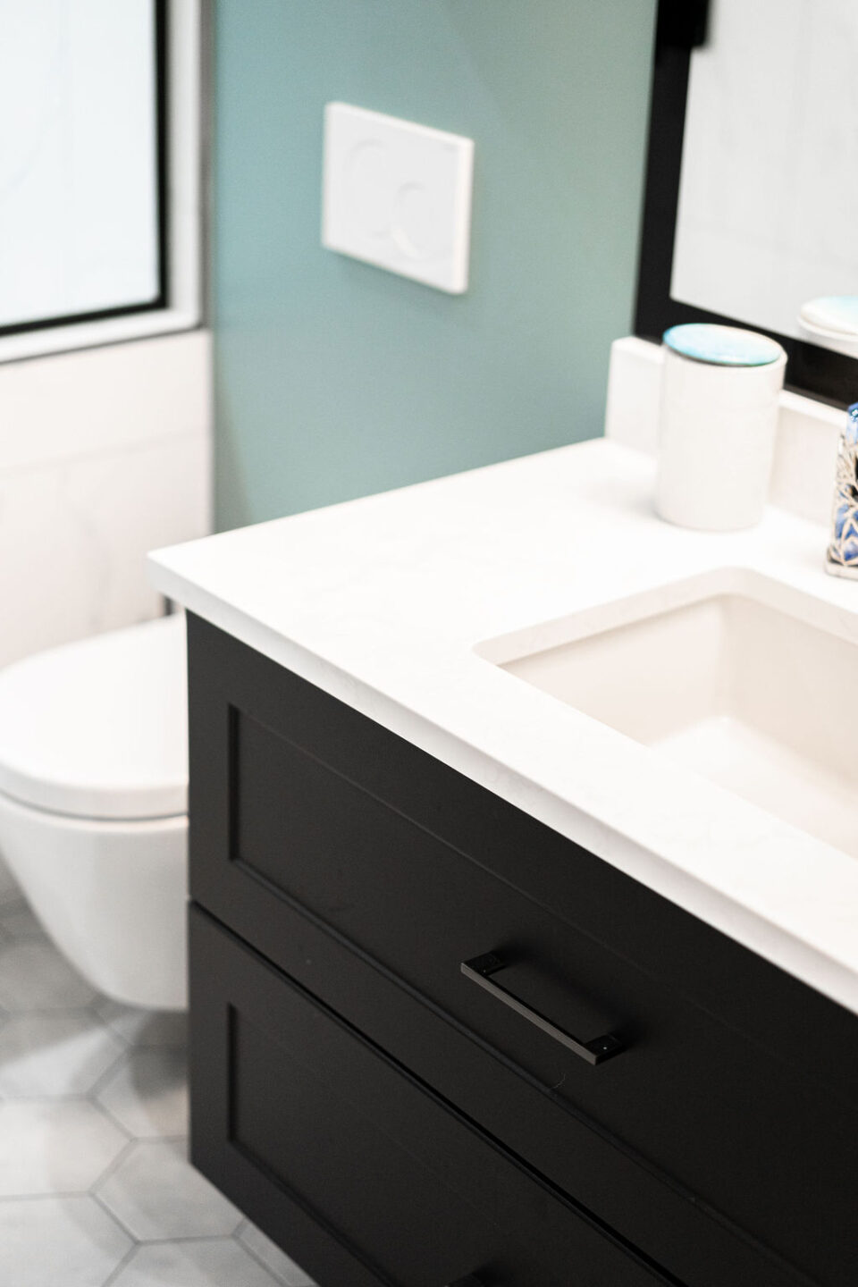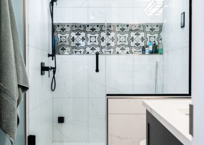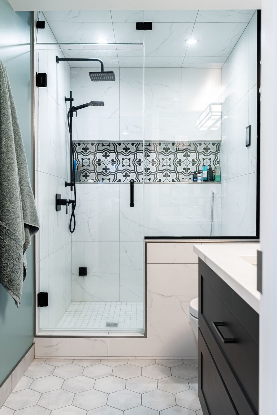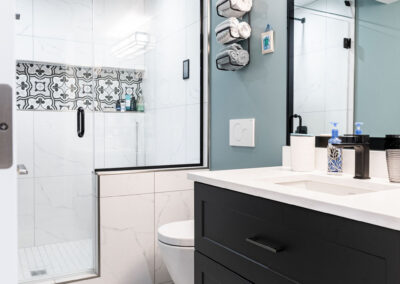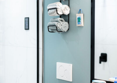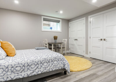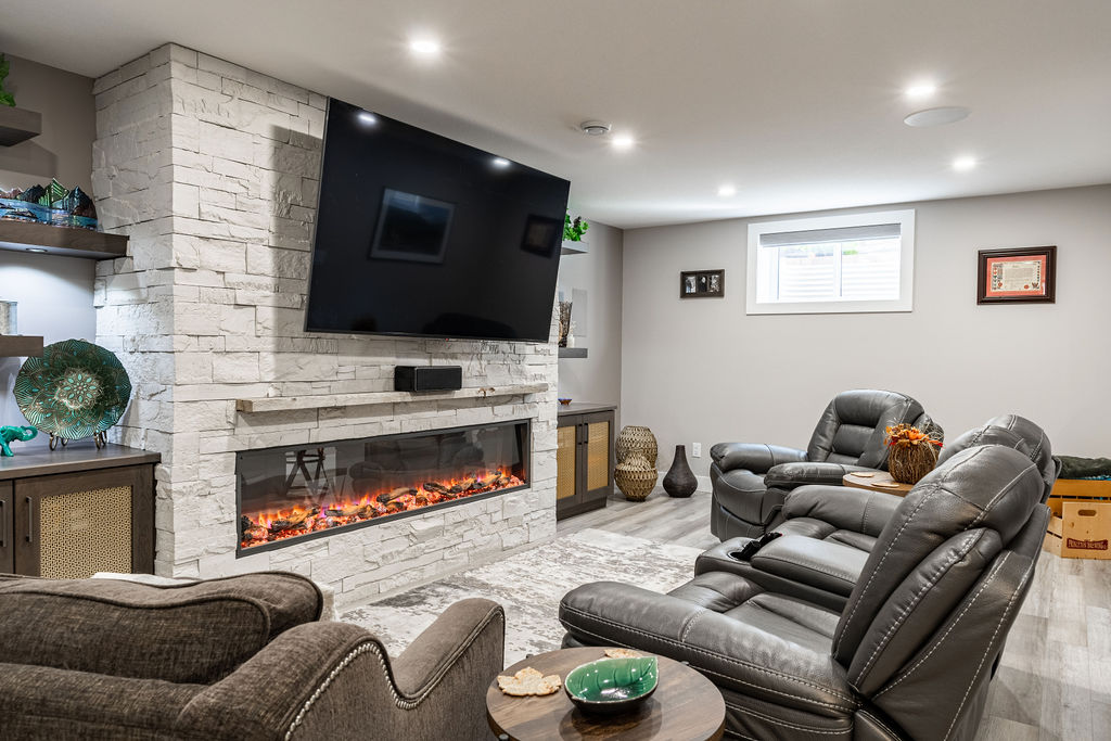 The aim of this entire project was to create a cozy space, and it was important that the floors did not have the “cold basement” feel. To achieve this we included the QuikTherm Insulated Warm Floor panels throughout the living area and electric floor heat under the tile in the bathroom. We also used the QuikTherm tongue & groove foam insulation panels on the foundation walls, which replaces the traditional batt & poly system and provides a radon barrier as well as thermal barrier values that exceed the National Building Code.