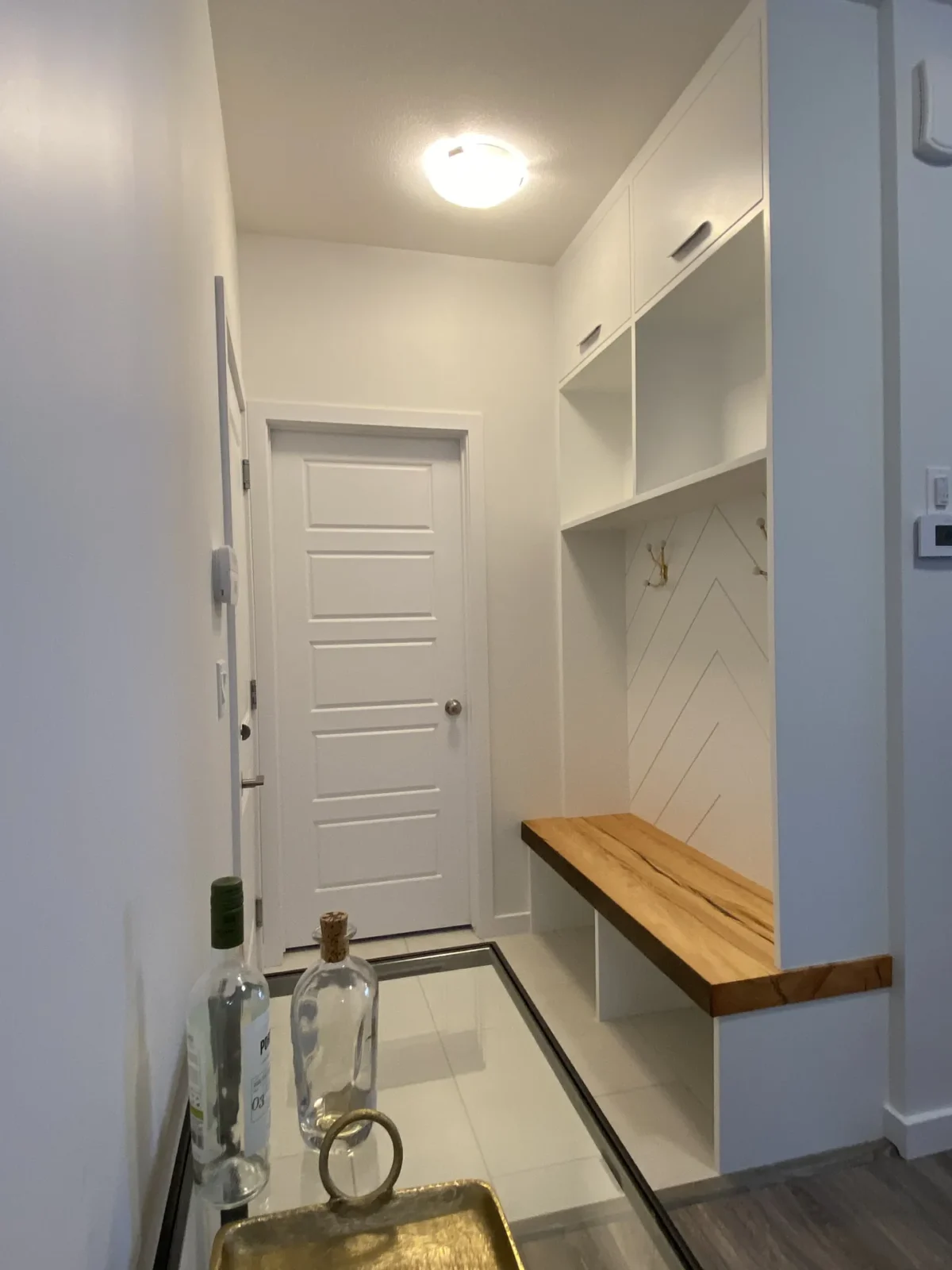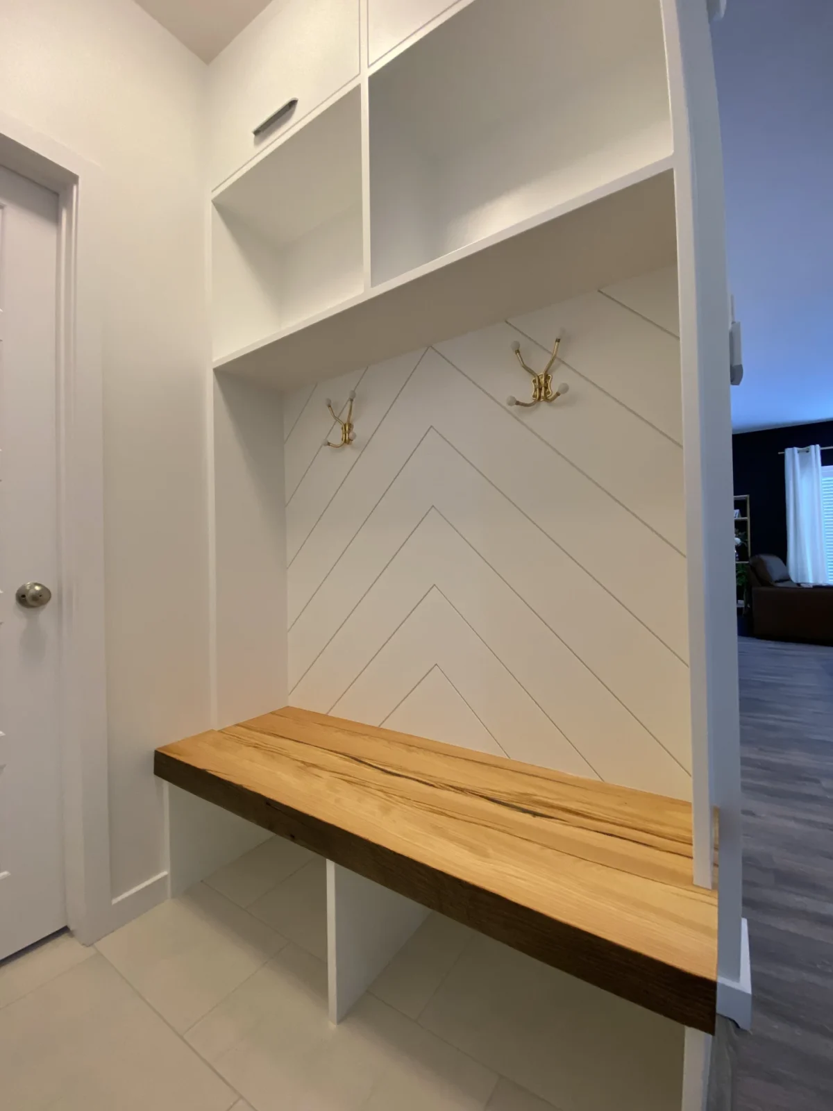 These features were completed in a fully finished house. They wanted to install a fireplace in the living area and make the back entrance more functional.