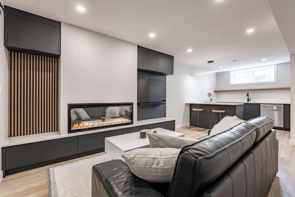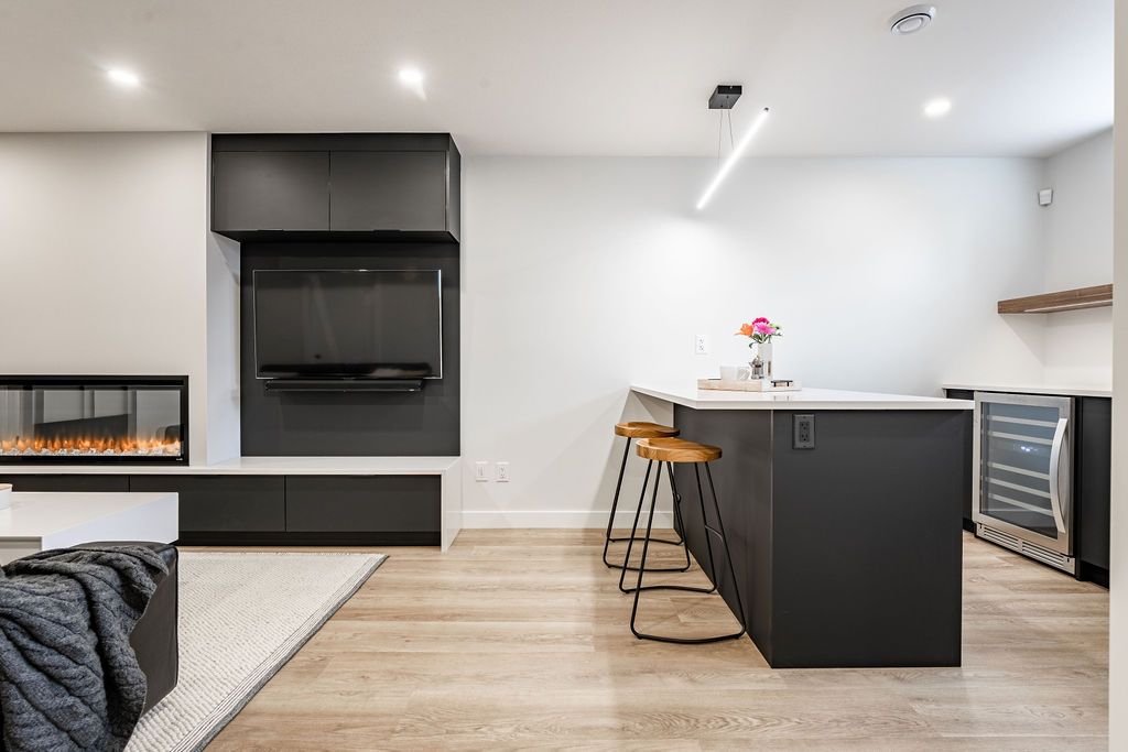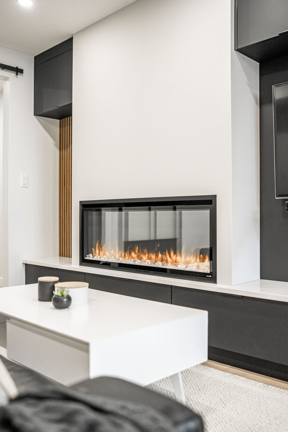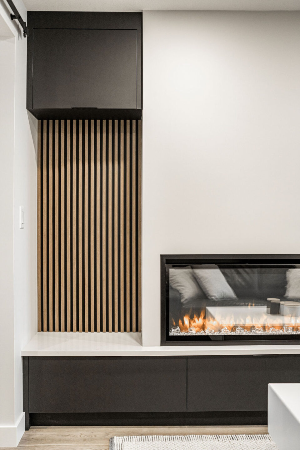 We also included a unique asymmetrical built in entertainment center with warm wood slat wall and matte black cabinetry to match the open kitchen.