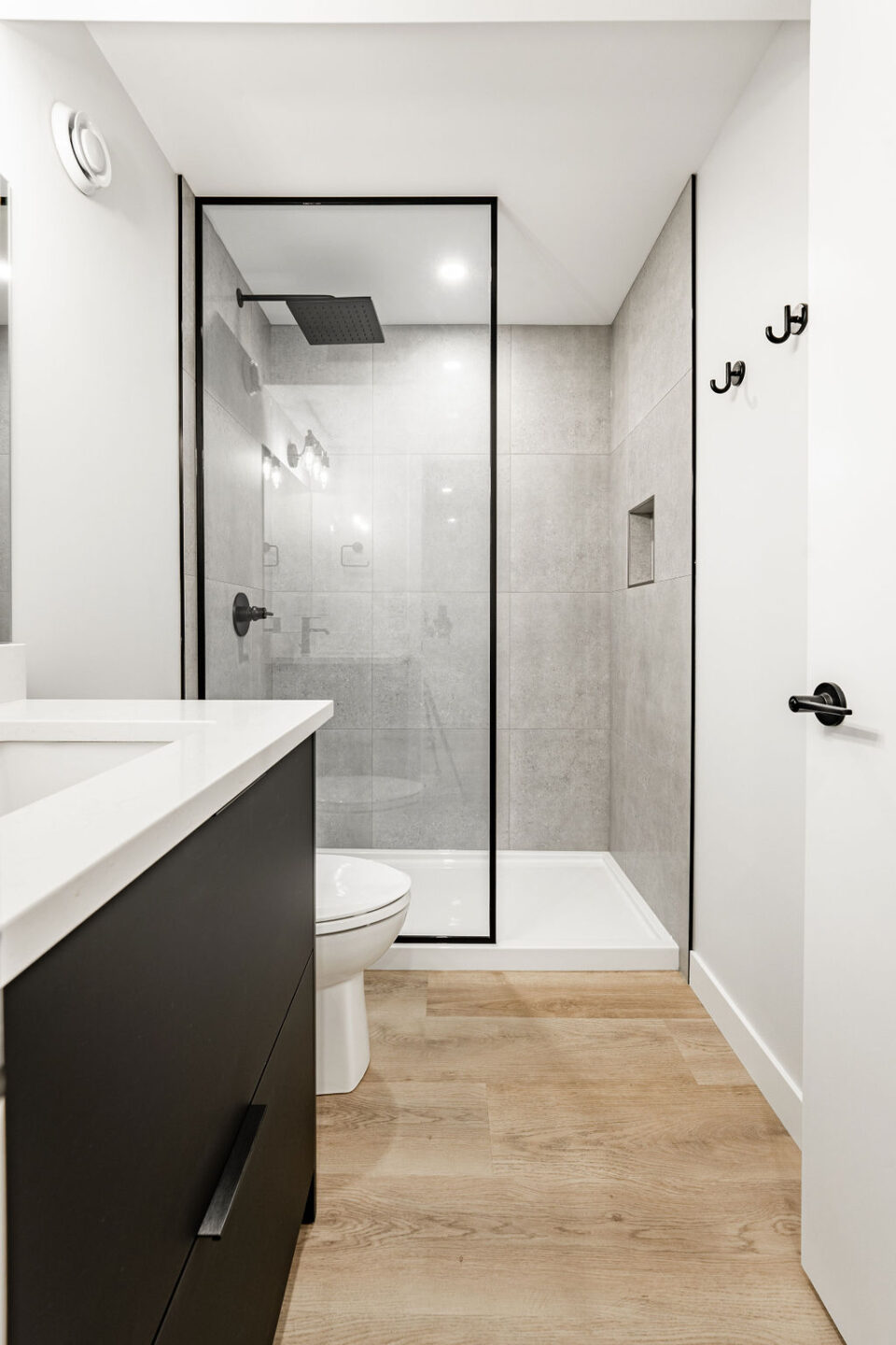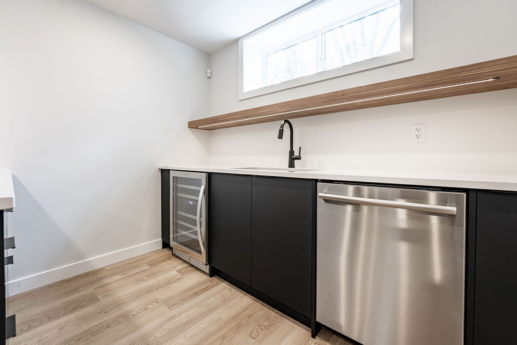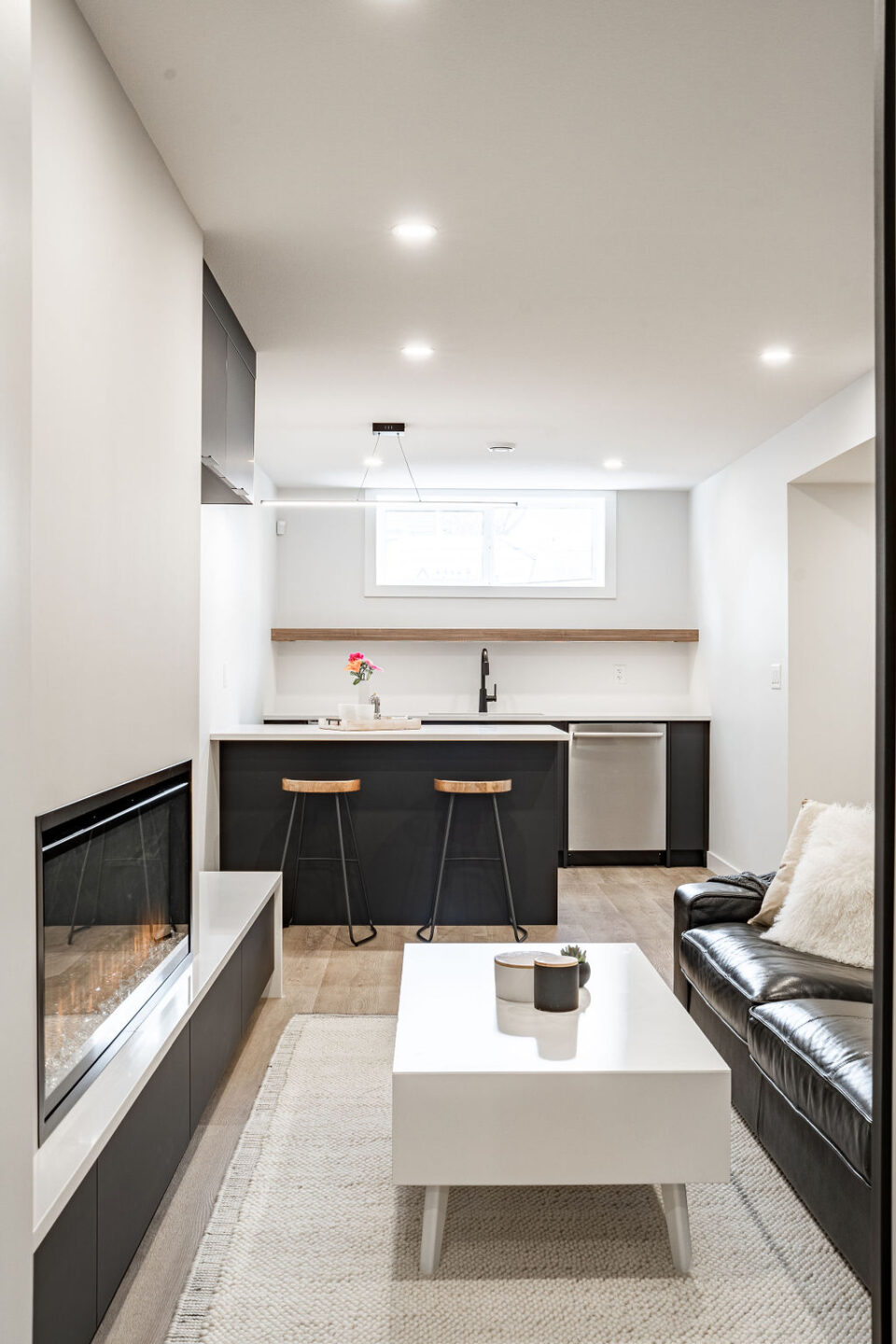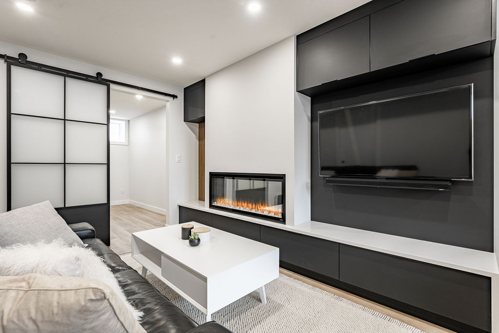 We also included a unique asymmetrical built in entertainment center with warm wood slat wall and matte black cabinetry to match the open kitchen.